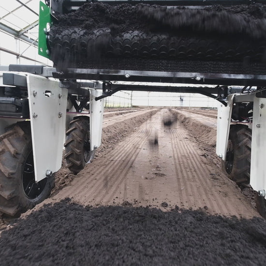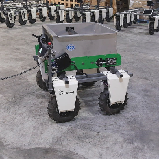 Farm Ng Compost Spreader for heavy loading and mounting onboard the Amiga with speed controlled driven discharge belt. (slight varied from photo)